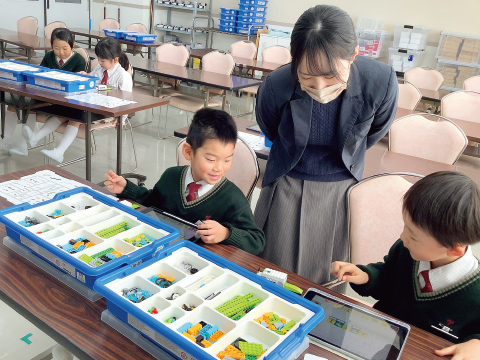 1、2年生はレゴブロック教材「lego We Do」を使用し、プログラミングの意味と仕組みを体験的に学びます。3年生以上は、世界的に普及しているプログラミング教育ブラウザ「コードスタジオ」に、学校として登録しています。生徒個人がアカウントを所有した中、それぞれのレベルに応じた課題をクリアしていく形で、コーディング(コマンドブロックの組み合わせ)に取り組んでいます。