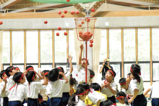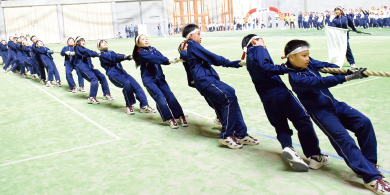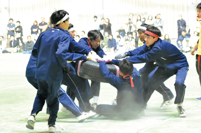 出場種目では限界まで力を出し切り、チームメイトが出場するときは精一杯応援します。低学年生は、高学年生のお兄さん・お姉さんの姿に尊敬とあこがれを抱き、高学年生は小さい生徒を気遣い面倒をよく見て、互いに協力・団結して、チームの勝利を目指します。名物種目「タイヤ取り」では、タイヤを互いに自陣まで引き合うのですが、最後1個のタイヤをめぐりドラマが生まれます。引きずられ、砂だらけになりながらも、最後の一瞬まで力を抜かず諦めなかった生徒には、全校生徒・全観客から賞賛の拍手が鳴り続きます。
