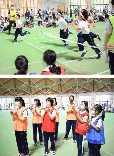 赤と青のビブスをつけたアンカーチームを先頭に、先輩や後輩の応援の声を受けながら入場してきた7年生と8年生。スタート前こそ笑顔を見せていた子もいましたが、競技開始の号砲が鳴るとその表情は一転して真剣そのもの。列の下に棒を通すためにジャンプする大切な役回りは全員に共通しているので、気の抜けない時間が続きます。
