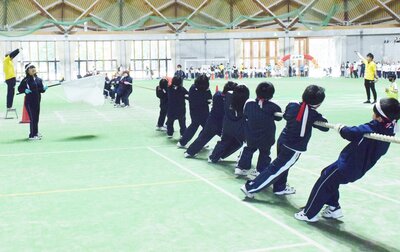 「棒引き」は、一本の棒を引き合い、自分たちの陣地に多く持ち帰った方が勝ちとなります。短距離走では個々の力を発揮した3・4年生が、ここではチーム戦に臨みました。競技は4回戦まで行われ、それぞれ勝てば10点、引き分けで5点が加算されます。