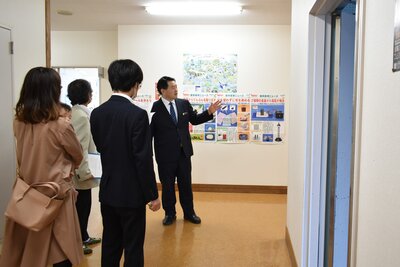 基本的に自由参観ではありますが、教頭による校内ツアーも実施。始業・終業のベルがないこと、時間割が毎週固定されていないこと、校舎内の掲示物や授業の説明などを交えてご案内させていただきました。