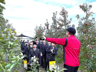 りんごは「隔年結果」といって豊作と不作を繰り返す現象が起こるそうです。今年は厳しい状況だと伺っていましたが、篠之井駅長の考慮もあり、例年通り収穫させていただけることになりました。生徒たちは「一番美味しいのは、どれですか」と聞いたり、「これ、とても大きいよ」と楽しみながら、商品として販売できる品質の実を、一人ひとつ、ていねいにもぎ取りました。