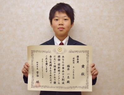 第31回松本市小中学生平和ポスター展において、井口真里花さん(7年)が中学生の部で最優秀賞を受賞しました。受賞作品は、用紙全面に数々の国旗が隙間なく並び、「PEACE」の文字とピースマークが描かれた色鮮やかなポスターとなっています。 井口さんは、「“平和”をキーワードに考えて、隣り合う国旗の枠線は描かず、世界が一つになったらいいなとの思いを込めた。」と話したほか、「(授賞式会場で小松校長から)直接『おめでとう』と声をかけていただいたことがうれしかった。審査員講評でも自分が気をつけて描いた部分を評価していただき、頑張った甲斐がありました。」と10月に行われた授賞式を振り返りました。