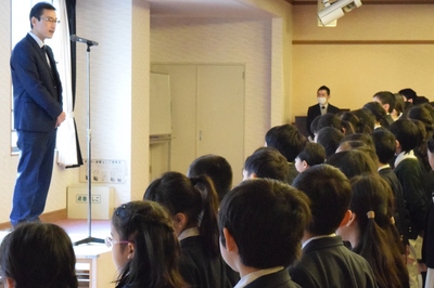 2月16日(土)に、第14回プレゼンテーションコンテストを行いました。 5年生から7年生までが個人で興味のあるテーマをひとつ選び、書籍やインターネットを通じての情報収集、アンケートや現地調査など、数カ月かけて調査・研究を続け、考察をしました。事前のクラス内予選(保護者審査)を経て代表に選出された10名は、本選までの1週間で修正や練習を重ねてきました。本選では校長をはじめとする審査員のみなさん、保護者のみなさん、大勢の生徒を前に、代表者はとても堂々としたプレゼンテーションを行いました。 審査の結果、最優秀賞に選ばれたのは、ハガキ1枚の強度について調べた加藤くん(5年)です。加藤くんは、ハガキサイズの紙の強度が折り方の違いでどのように変わるのか、水入りペットボトルが乗った本数をグラフに表して比較しました。同じ筒状でも円柱・四角柱・星型など頂点の異なるかたちにしたとき、もっとも強かったのは円柱で23㎏まで耐えられたそうです。この延長で、用紙の厚さを変えて同様の実験を行い、加藤くんが「極厚紙」と呼ぶ紙では、2リットルのペットボトル17本分に相当する35㎏という記録が出たそうです。考察として「①紙は円柱形の状態が一番強い ②頂点の数が多いほど強くなる ③厚みがあるほど強くなる」とまとめました。 講評では、「自分の作った資料はずっと大切にしてほしい」「どのプレゼンテーションも甲乙つけがたかった」「来年のコンテストをさらに楽しみにしています」などの感想をいただきました。 審査員のみなさんには、厳正な審査にご協力いただき、本当にありがとうございました。 〈審査結果〉 最優秀賞 5年 加藤 紬くん 「一枚のハガキの強度」 優秀賞 7年 伊野翔真くん「刀と日本語」