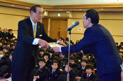 12月19日(水)、2学期終業式を行いました。 【校長講話】 「知者不惑、仁者不憂、勇者不懼」 今年の大河ドラマの主人公・西郷隆盛や当時の武士階級の人々は、幼少期から「儒学」を通じ自らを鍛えていました。儒学とは、中国古代の思想を基に、孔子が述べた言葉を様々な角度から解釈した学問で、そのうちのひとつを取り上げようと思います。 「知者」は、知識や真理といったものをしっかり学び取った人のこと。正しく学んだ者は、その知識に基づき厳しい決断・判断ができるようになります。みなさんが今後、幾度の曲がり角を迎え、覚悟をもって決断していかなければいけないときに正しい判断ができるように学び続けること、それが「知」です。 「仁者」とは強い心を持った人のこと。周囲の人への思いやりを持った者は、小さなことに不平不満を言ったり、失敗を嘆いたりしません。仲間をつくるとき、集団や社会をつくるとき、人と人とが結び合うときには、まごころや思いやりが不可欠です。心を鍛え、自分の中にしっかりと「仁」を宿しましょう。 「勇者」とは、西郷隆盛の様に、本当の勇気を持って自ら行動し、挑戦することを恐れない人です。陽明学の神髄に「知行合一」とあるように、いいことを学び、心をよくしても、行動に移さないと意味がないのです。 こうした考えと原点を同じくするのが、『才教の心得』です。 「知者」になるためにどんな努力をしてきましたか。「仁」を持つ人になるためにどのような行動をしてきましたか。「勇者」として挑戦できる人間になるために、自分に足りないものは何か。これらを念頭に今年を振り返り、改めるべきところは改め、新しい年に元気な姿で戻ってきてください。 【賞状伝達式】 2学期の成績優秀者、絵画コンクールの入賞者に、校長から賞状が手渡されました。